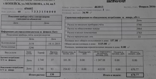 «Там электрические швейные машинки работают постоянно. Магазин работает с 9 до 23 часов, у них холодильники, другое электрооборудование», - рассказывают жители дома. При этом, например, в квитанции, которая пришла Раисе Поповой за февраль, в графе, где указан расход, указано, что всего за месяц дом израсходовал 5780 кВт/часов электроэнергии. При этом все жители в своих квартирах израсходовали 2783 кВт/часов, на общедомовые нужды израсходовано 2964 кВт/часа (заметьте, ОДН превышает внутриквартирное потребление! – Авт.), а юридическое лицо сожгло всего-навсего 33 кВт/часа!