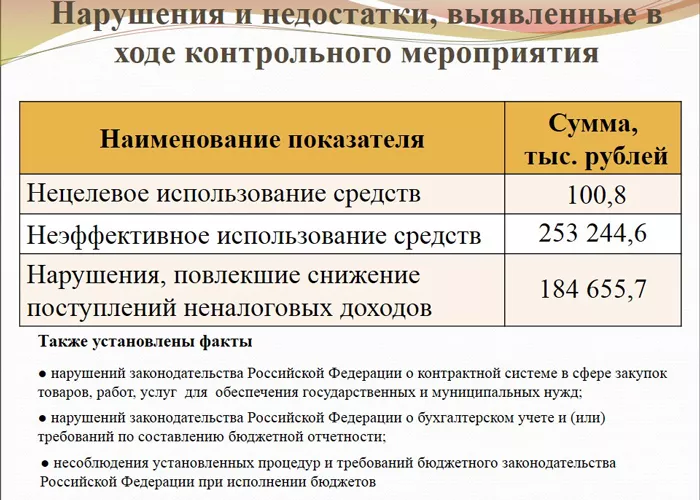 Если говорить о нецелевом использовании денег, то здесь нарушений сравнительно немного. Аудиторы выявили фактов нецелевого использования на общую сумму 100,8 тыс. рублей. Зато бросается в глаза сумма, которая, по мнению проверяющих, истрачена неэффективно — когда деньги были потрачены, но поставленные цели не достигнуты. По результатам проверки неэффективные траты бюджета КГО составили 253,2 млн. рублей.