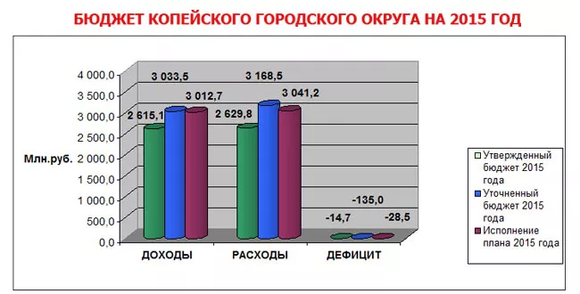 Бюджет Копейского городского округа по расходам на 2015 года утвержден в сумме 2 629,8 млн. рублей, годовой план увеличен на 12 процентов, или плюсом 538,7 млн. рублей, и составил 3 168,5 млн. рублей.