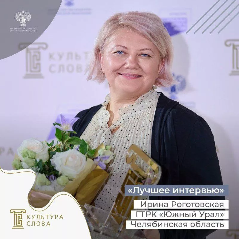 Шеф-редактор отдела тематического вещания и спецпроектов гостелерадиокомпании «Южный Урал» Ирина Роготовская победила в третьем Всероссийском конкурсе прессы «Культура слова» в номинации «Лучшее интервью». Она выпустила сюжет, в котором взяла интервью у министра культуры региона Алексея Бетехтина.