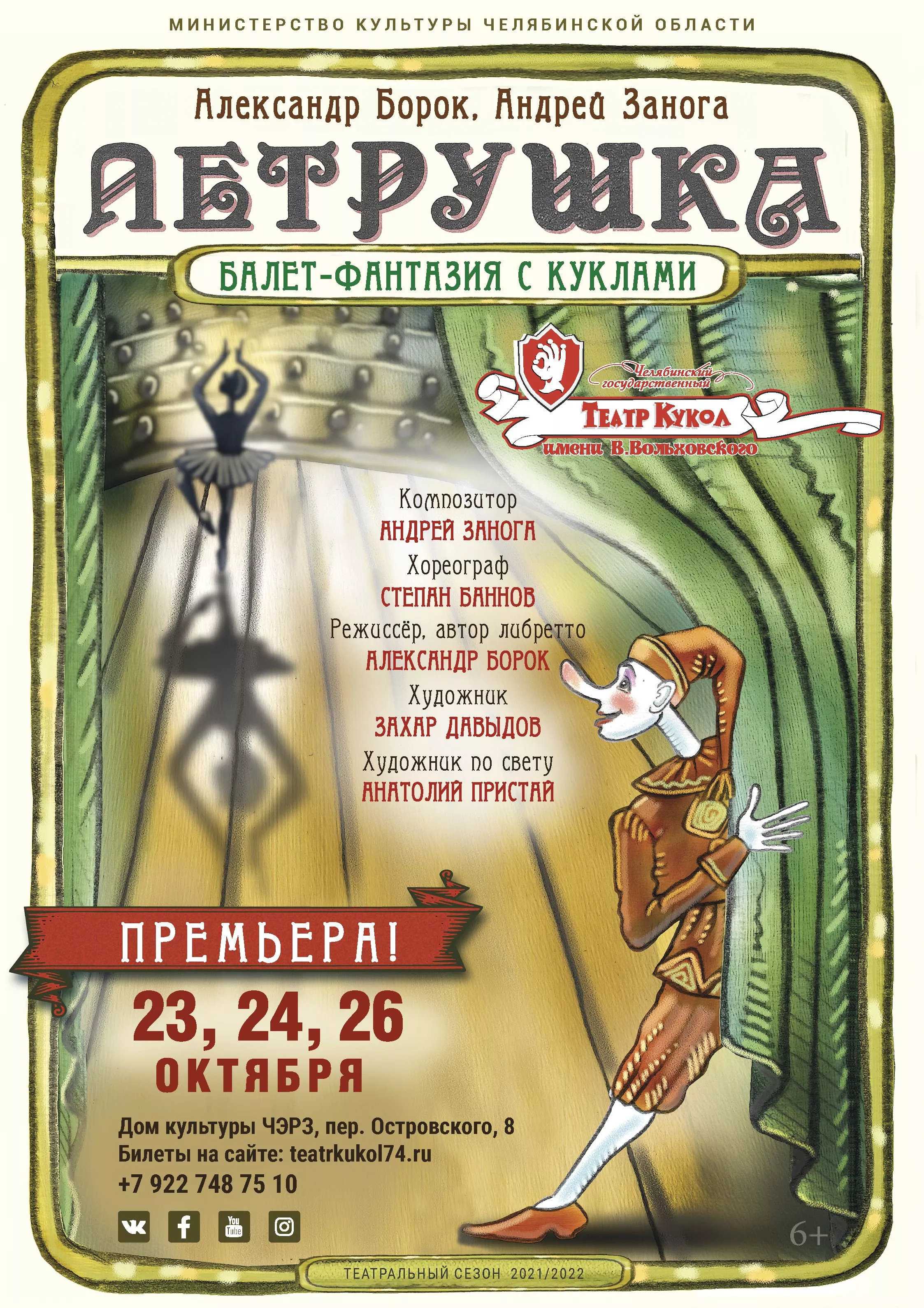 Премьера состоится 23, 24 и 26 октября на сцене ДК ЧЭРЗ по адресу переулок Островского, 8.С афишей можно ознакомиться на сайте театра, билеты приобрести в городских зрелищных кассах, сайте teatrkukol74.ru и в ДК ЧЭРЗ. Продажа билетов ограничена до 99 мест, так что QR-код зрителям не потребуется.