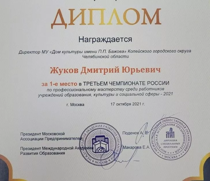 Руководитель дома культуры имени П. П. Бажова Дмитрий Жуков занял первое место в чемпионате России по профессиональному мастерству среди работников учреждений образования, культуры и социальной сферы – 2021.