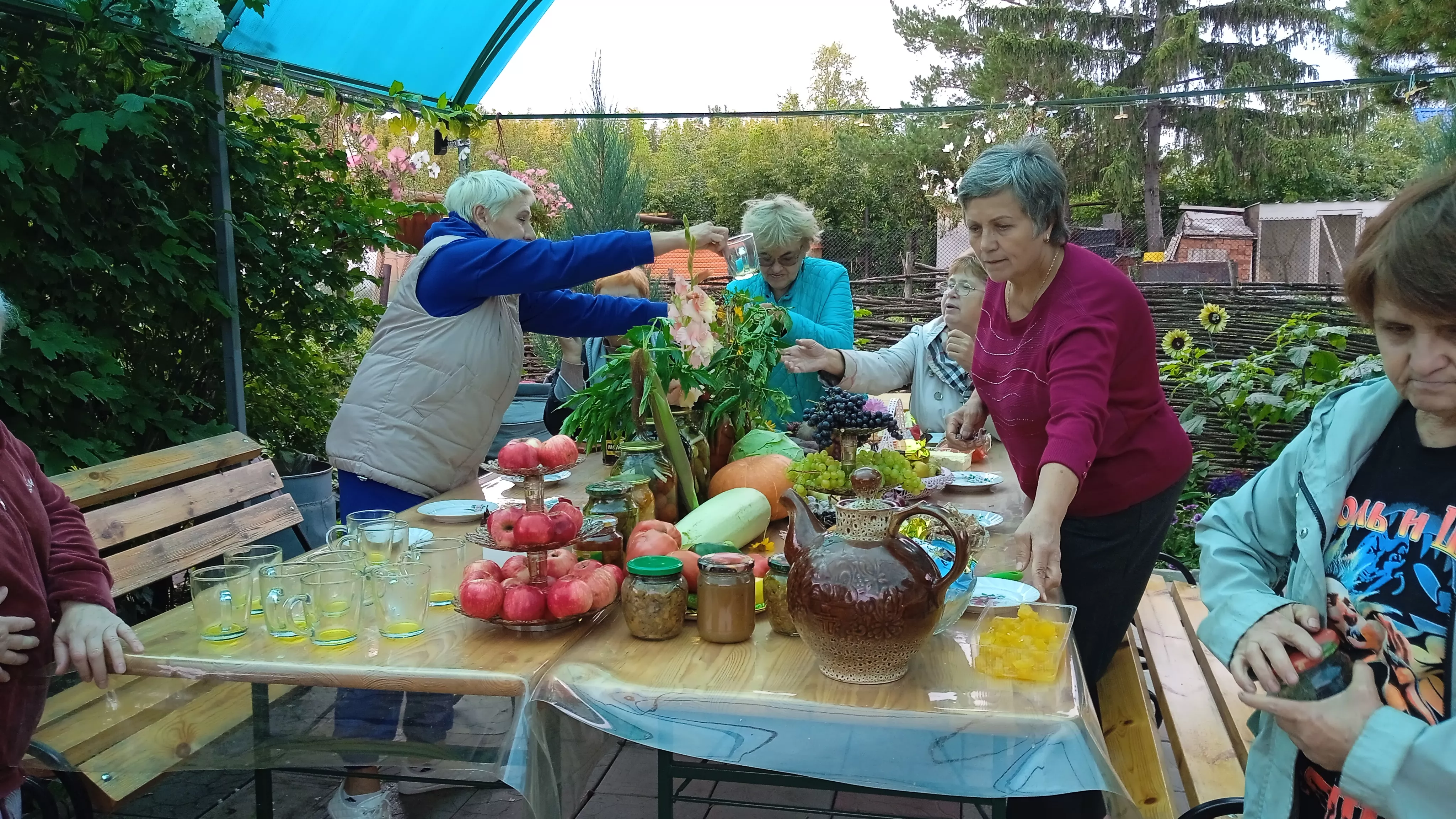 В преддверии праздника Дня садовода, растениеводы Копейска решили отметить свой праздник, собравшись у Тамары Дударевой в саду, пили чай и угощали друг друга своими заготовками.
