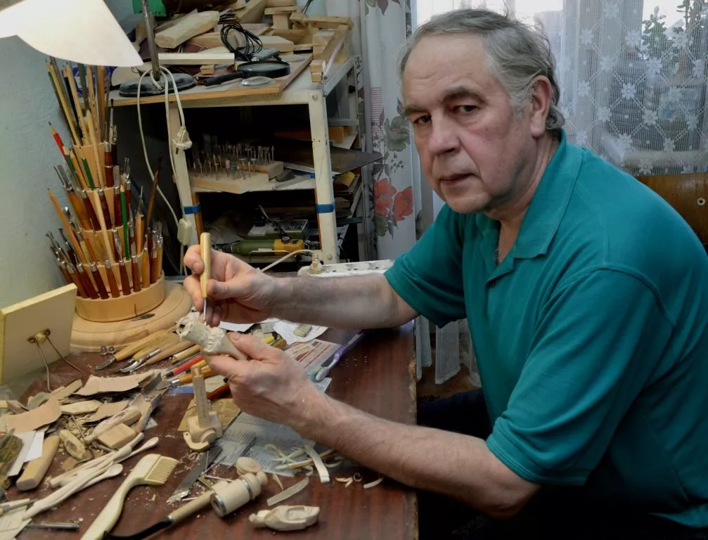 Сергей Николаевич специально резьбе нигде не учился, он тот самый народный умелец. В детстве мальчишке нравилось рисовать, лепить фигурки из пластилина. И не просто абы как, а со смыслом определённым. Быстро понял, что может больше. Бабушка с дедушкой жили в своём доме с печным отоплением. Во дворе было много дров. Мастерил пистолетики, машинки, клюшки, так и увлёкся. В юности сделал сам себе первый специальный нож, попробовал резать – получилось.
