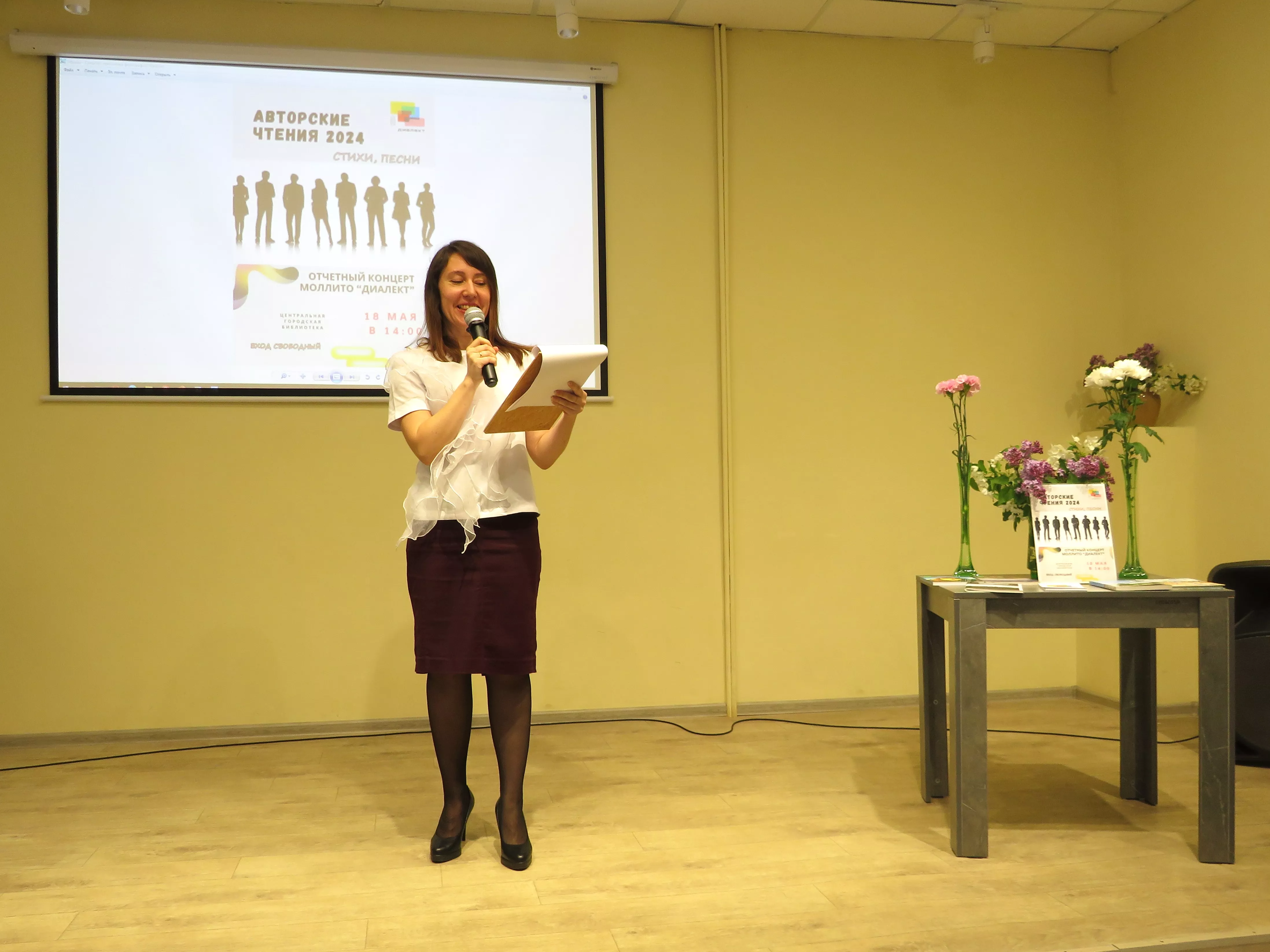 Марина Калмыкова, руководитель «Диалекта, рассказала о достижениях и успехах авторов. Зрители увидели интересные моменты из жизни литературного объединения.