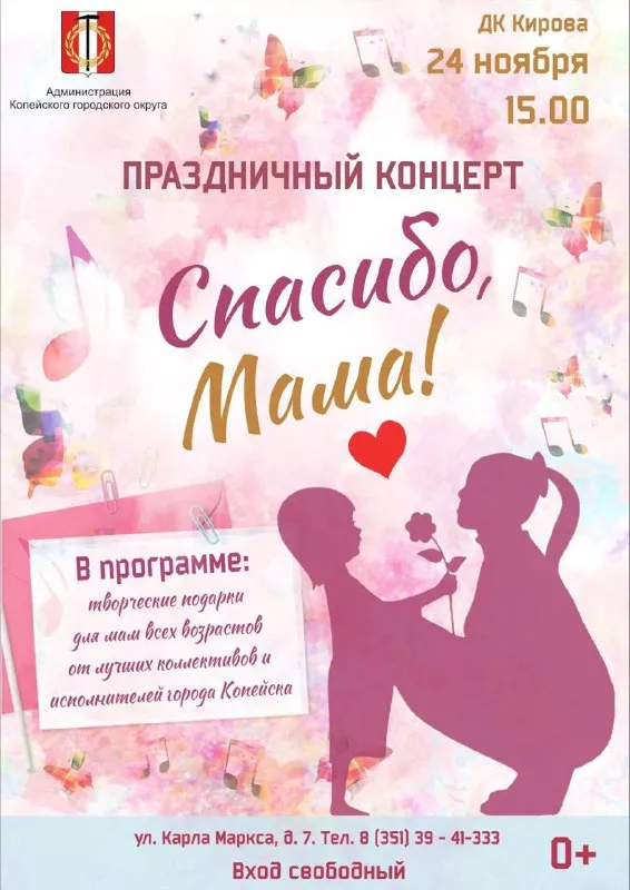 Во Дворце Культуры имени Кирова грода Копейска Челябинской области 24 ноября в 15:00 пройдет городской праздничный концерт. Мероприятие посвящено Дню матери, который традиционно отмечают в последнее воскресенье ноября.