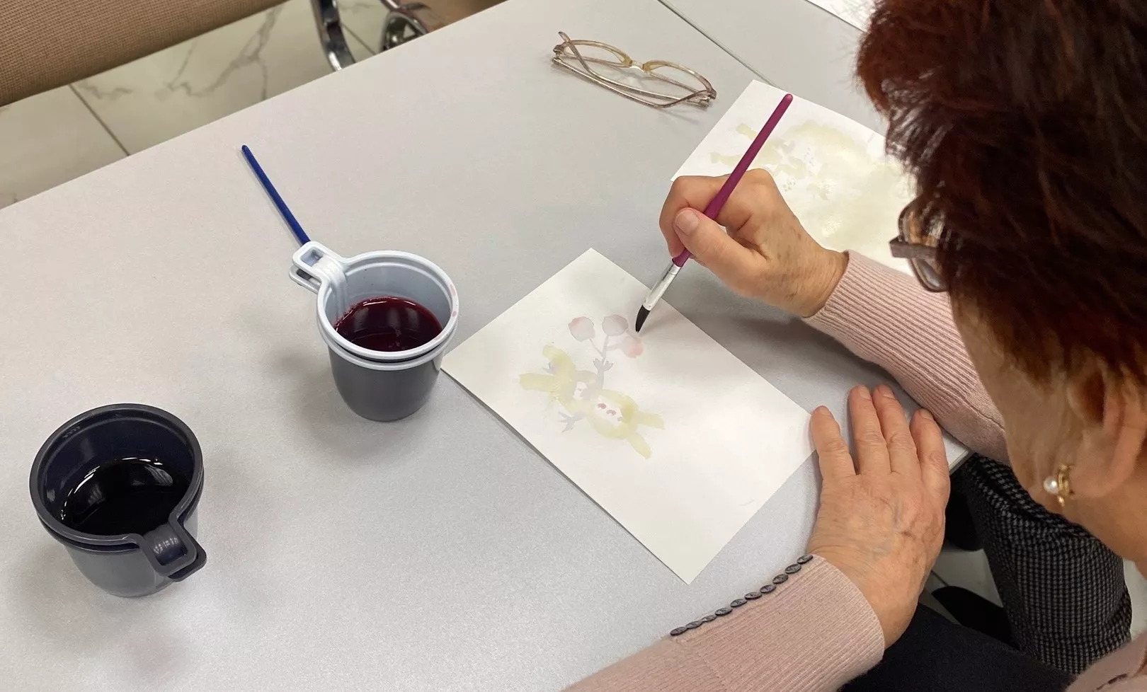 Для приготовления необычной краски были приготовлены два вкусных настоя: черный листовой и красный из лепестков суданской розы. При высыхании данные растворы дают оттенки коричневого и серо-сиреневого цвета.