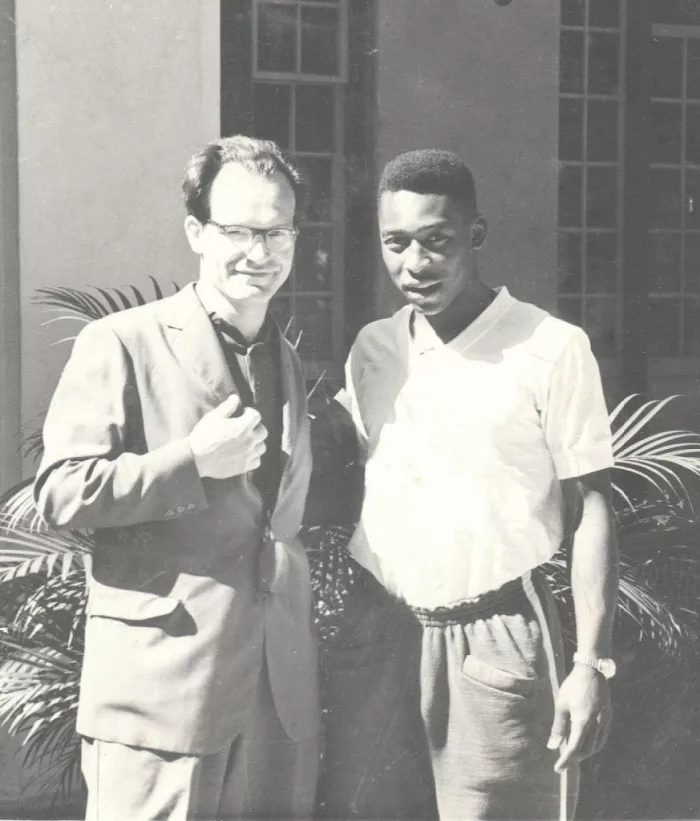 В один из дней у отеля «Корковадо» советские инженеры (в эти дни в Рио проходила международная выставка) встретили главных звезд сборной Бразилии – Пеле и Гарринчу. В момент беседы, которая длилась около пяти минут, и был сделан этот памятный снимок. Пеле высоко оценивал шансы сборной Советского Союза на предстоящем первенстве планеты, прочил нам выход в финал.