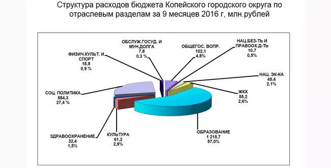 В структуре расходов 844,1 миллиона рублей направлено на вопросы местного значения, 1289 миллиона — на исполнение государственных полномочий. При этом более половины бюджетных средств идет на оплату труда работников бюджетной сферы, за три квартала на эти цели направлено 1157,7 миллиона рублей, или 54,3 процента от общих расходов.