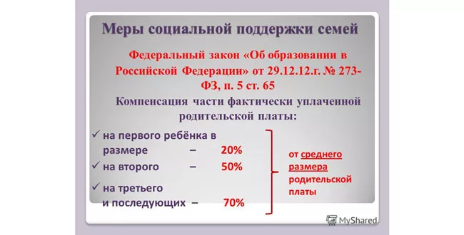 Размер компенсации родительской платы определяется очередностью ребенка в семье. За первого ребенка государство ежемесячно компенсирует 20 процентов от начисленной суммы, за второго — 50 процентов, за третьего и последующих детей — 70 процентов. Право получать компенсацию предоставляется тому родителю или законному представителю ребенка, чье имя значится в квитанции на оплату услуг детского сада. Деньги на руки родителям не выдаются: сумма компенсации автоматически вычитается из начислений после того, как отец или мать ребенка напишут заявление о предоставлении компенсации и представят в бухгалтерию дошкольного учреждения копии свидетельств о рождении детей. Следует учесть, что при несвоевременной оплате детского сада (после 20-го числа текущего месяца) компенсация начисляется с задержкой на один месяц.