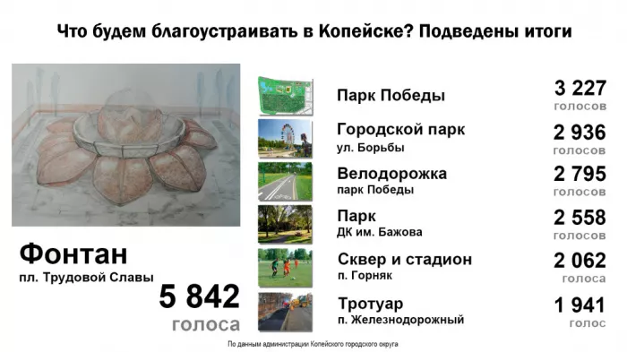 По итогам голосования наибольшее количество голосов было отдано в пользу строительства фонтана на площади Славы (5842 голоса).