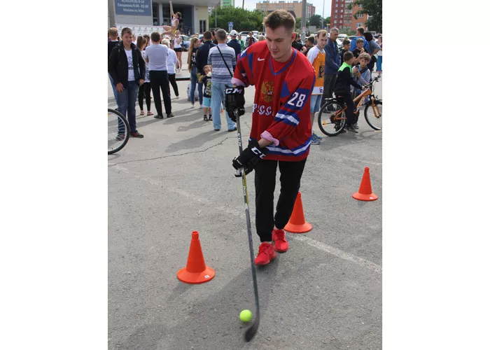 Мальчишки от мала до велика играли в уличный хоккей, отважно «сражаясь» на импровизированном поле со звездами КХЛ. Ребята с азартом гоняли теннисный мяч клюшками по траве и даже сумели забить гол капитану хоккейной команды «Урал» Николаю Балмашнову.