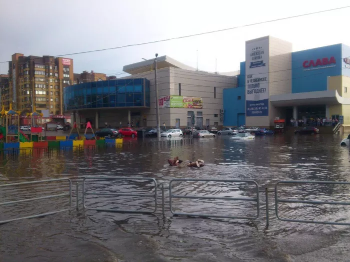 В соцсетях мы нашли фото копейчанина, который перебирался до назначенного места на надувном матрасе.И хотя фото было сделано не в этот день, а ранее, все же надо отметить, что этот способ передвигаться около ТК Слава после дождя остается актуальным и по сей день.