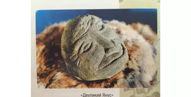 Отмыв круглый голыш, экскаваторщик обнаружил странную каменную головку человека серо-зеленого цвета. Сработана она была из песчаника. Изучив находку под микроскопом, ученые пришли к заключению, что ваялась скульптура мелкими колющими ударами острым предметом. Сегодня «двуликий Янус» экспонируется в музее заповедника Аркаим.