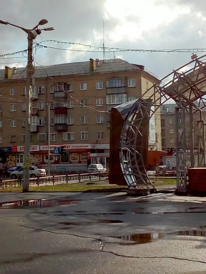 Нынешней ветреной весной на крыше малой сцены уже около месяца слышались хлопки. Это оторвался краешек покрытия и поднимался в ветреную погоду, заставляя прохожих с опаской поглядывать вверх. А сегодня ночью оторвалась вся левая половина крыши. На этот огромный кусок даже издалека страшно смотреть, ведь он может в любой момент оторваться и, не дай Бог, полететь в сторону людей. В этом случае нельзя гарантировать, что пострадавшие останутся живы и здоровы.