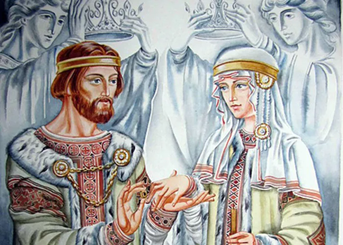 История любви этой святой пары описана в древнерусской повести под названием «Повесть о Петре и Февронии Муромских». В ней говорится о том, что Петр был сыном Муромского князя Юрия Владимировича и вступил на престол в 1203 году. А за несколько лет до этого заболел проказой, и не мог вылечиться. Однажды ему приснилось, что исцелить его сможет только одна крестьянка - дочь пчеловода Феврония. Девушка была очень мудрой, доброй и благочестивой.