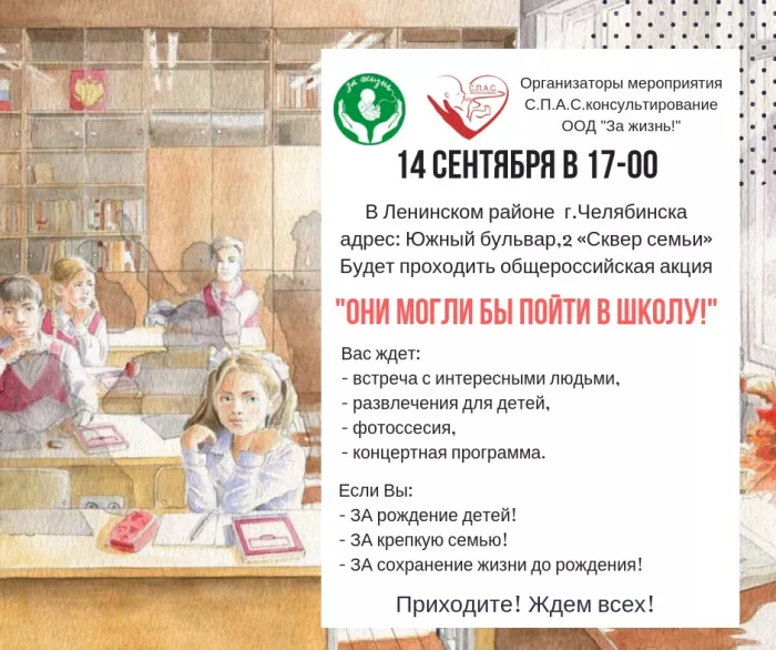 Сегодня, 14 сентября, в 17:00 в Ленинском районе Челябинска пройдет всероссийская акция «Они могли бы пойти в школу». Помимо столицы Южного Урала в социальном проекте, направленном на профилактику абортов, участвуют тридцать три региона страны.