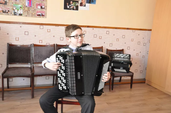Восьмиклассник Максим Кондаков вот уже пять лет учится в детской школе искусств №2 по классу баяна. В семье подростка никто музыкой не увлекался: мама Татьяна Сергеевна работает хлебопеком, папа Евгений Сергеевич трудится на предприятии. Бабушка, правда, любит и умеет петь народные песни, в свое время ходила в хор. А вот Максим теперь уже не мыслит себя без музыки, без любимого инструмента. Эти баянные кнопочки стали для него волшебными, потому что позволяют погружаться в удивительный мир звуков, музыки.