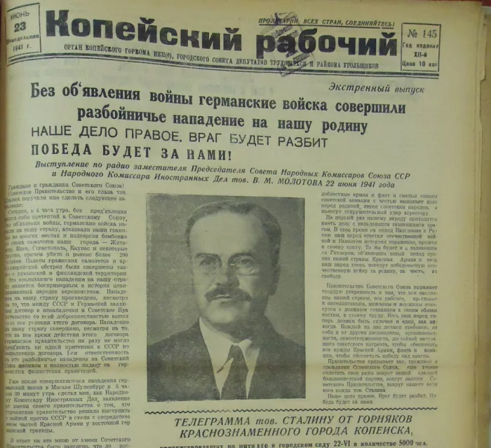 Новость о начале Великой Отечественной войны появилась на страницах копейской газеты 23 июня, когда вышел экстренный выпуск «КР».