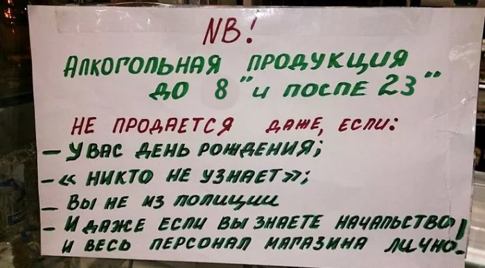 Продажу алкоголя регулирует федеральный закон №171. Сегодня запрещена торговля алкоголем вблизи детских, образовательных, медицинских учреждений. За это лишают лицензии. Полностью запрещена торговля спиртным в государственные праздники: День защиты детей, День молодёжи, Последний звонок, 1 сентября и другие. Также закон запрещает продажу спиртных напитков с 23 часов до 8 утра. Но в некоторых регионах нашей страны местные власти решили ещё более ужесточить данные правила. К примеру, в Тюмени не продают алкоголь с 21 часа до 10 утра, в Санкт-Петербурге с 22 до 11 часов. В Якутии спиртное можно купить в промежуток между 14 и 22 часами, а в Чечне алкоголь продают всего два часа в сутки- с 8 до 10 утра.
