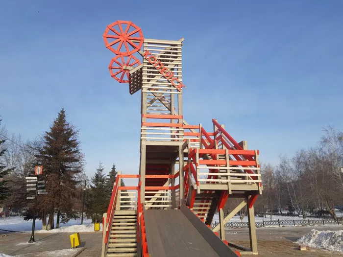 Деревянная горка в виде шахты – украшение и гордость нашего зимнего городка. Она изготовлена в прошлом году по специальному проекту к 110-летию города с шахтерской историей. Ее конструкция позволяет безопасно прокатиться и взрослым, и малышам, так как две отдельные лестницы ведут на два спуска разной высоты. Однако в процессе эксплуатации выявился один серьезный минус – с обеих спусков очень быстро стирается ледовое покрытие. В итоге большая горка очень плохо скользит, а по маленькой дети попросту ходят пешком, потому что скатиться вообще невозможно.
