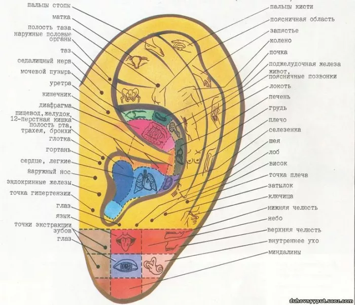 На наших ушах, как и на всем теле, расположены биологически активные точки, отвечающие за все органы организма, за их функции. Считается, что ушная раковина подобна эмбриону человека, то есть по форме похожа на него, и точно так же расположены биологически активные точки. Предлагаем познакомиться с их локализацией согласно учению П. Ножье (французский врач, изучающий древнюю китайскую медицину).