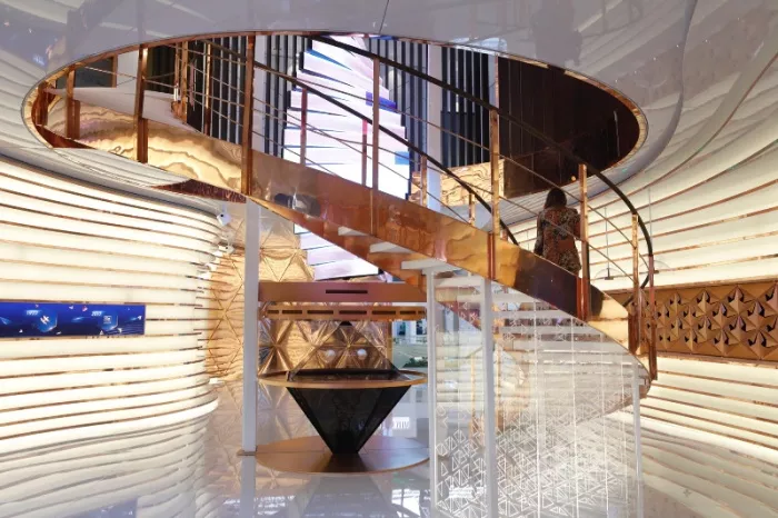 Посетителям стенда РМК предстоит пройти через масштабный калейдоскоп, стены которого созданы в форме кристаллической решетки меди. Видеоряд из изображений медьсодержащих минералов создаст иллюзию погружения вглубь структуры, самую суть меди. Главная идея экспозиции находится в центре стенда – это мультимедийная колонна в виде молекулы ДНК и голографическая пирамида, олицетворяющие главную идею экспозиции: «Медь – ДНК цивилизации». Голографическую модель образуют вращающиеся мультимедийные устройства, которые создают впечатление парения изображаемого объекта в воздухе.