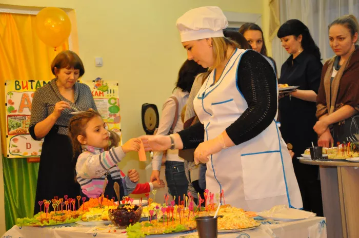 Также сотрудники садика вместе с ребятами подготовили целую шоу-программу, в которой напомнили о необходимости правильного питания для дошкольников и их родителей, рассказали о принципах организации здорового питания, прочитали стихотворения и пословицы о полезных продуктах. Воспитатель Анна Кузнецова вместе со своим сыном Иваном провела мастер-класс по приготовлению полезных конфет.