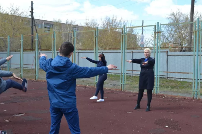 Зарядку для ребят провела призер чемпионата России по дзюдо, кандидат в мастера спорта по дзюдо стажер по должности полицейского кинолога патрульно-постовой службы полиции Отдела МВД России по городу Копейску Алена Бадтрутдинова.