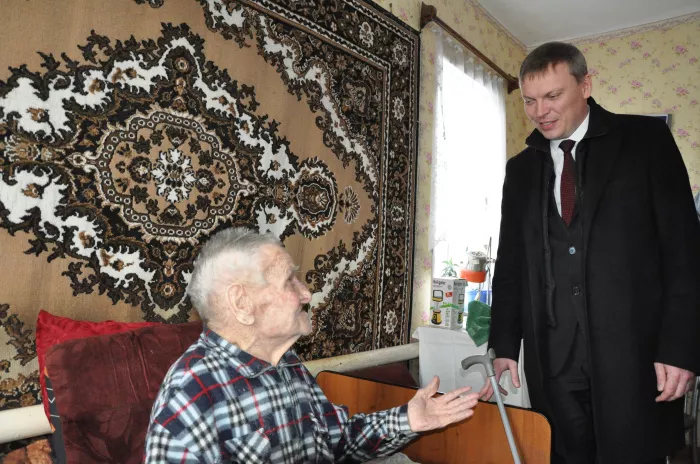 В феврале нынешнего года частный дом по улице Декабристов, в котором проживает ветеран войны, был признан непригодным для проживания. Андрей Фалейчик расспросил ветерана о боевом прошлом, о том, как он живет сейчас, в свою очередь Алексей Егорович поблагодарил руководителя муниципалитета за работу и пригласил на новоселье. Рассказал, что для него предстоящий переезд событие очень радостное. «Не меня надо благодарить, а президента России и губернатора», - ответил Андрей Фалейчик.