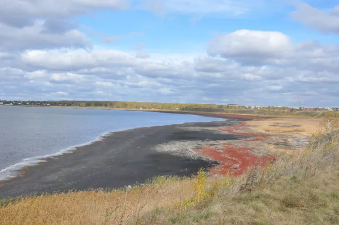 Пересохшие бассейны технических сооружений, каждое из которых по площади равно примерно трем футбольным полям, конечно, впечатляют. Но все-таки больше эмоций вызывает черное озерное побережье: оно дымит.