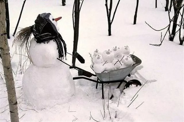 Такую необычную композицию сфотографировала жительница Магнитогорска. В саду у ее друзей появилась семья снеговиков: снежная баба, которую украшают головной платок и морковка, а также ее маленькие детки в садовой тачке.