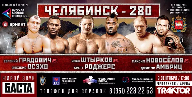 Напомним, уникальное Гала-шоу «Челябинск-280» состоится на арене «Трактор» 9 сентября в 17.00. В рамках турнира пройдёт 12 боёв. Бойцы сразятся в разных видах спорта: профессиональный бокс, любительский, ММА и муайтай. Организаторы (промоутерская компания «Титов Боксинг Промоушн»), при поддержке губернатора Бориса Дубровского, администрации города и генеральных партнёров (Русская медная компания, холдинг «Ариант») обещают пять захватывающих часов. Специальный гость Гала-шоу – группа «Баста».