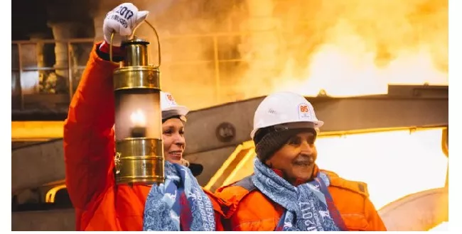 Как сообщает пресс-служба Магнитогорского металлургического комбината, почетные сотрудники ММК Василий Окунев и Геннадий Черных, чей общий стаж работы в доменном цехе составляет почти 60 лет, зажгли огонь от раскаленного чугуна, только что вырвавшегося из печи.
