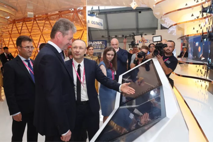 Экспозицию РМК посетил и губернатор Челябинской области. Председатель Совета директоров Русской медной компании Игорь Алтушкин продемонстрировал Борису Дубровскому основные проекты корпоративной социальной ответственности РМК, рассказал о планах развития производства на Михеевском ГОКе и КМЭЗе и показал современные мультимедийные выставочные решения, которые внедрила РМК в своей экспозиции.