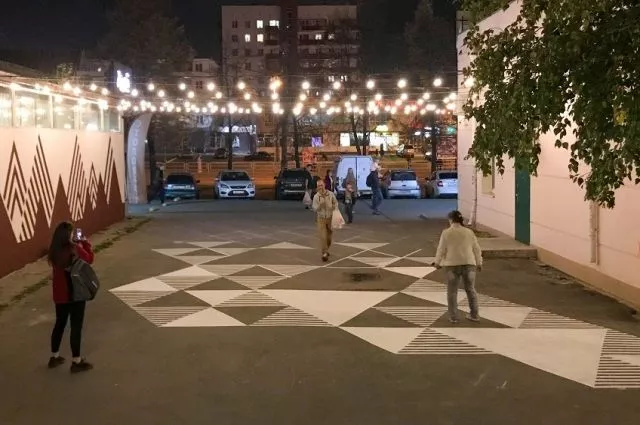 Урбанисты во главе с Львом Владовым решили обустроить городское пространство. Они уже убрали пластиковый сайдинг со стены, оштукатурили и нанесли на нее и на асфальтовое покрытие орнамент. А еще активисты повесили гирлянду, которая загорается по сигналу датчика освещенности.