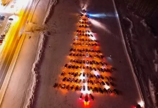 Елка из машин была построена в ночь 29 декабря. Для красоты многие автомобили были дополнительно украшены гирляндами, так что автоелка получилась весьма яркой. А для того, чтобы запечатлеть всю эту красоту, водители сняли все происходящее с высоты. Смотрите сами.