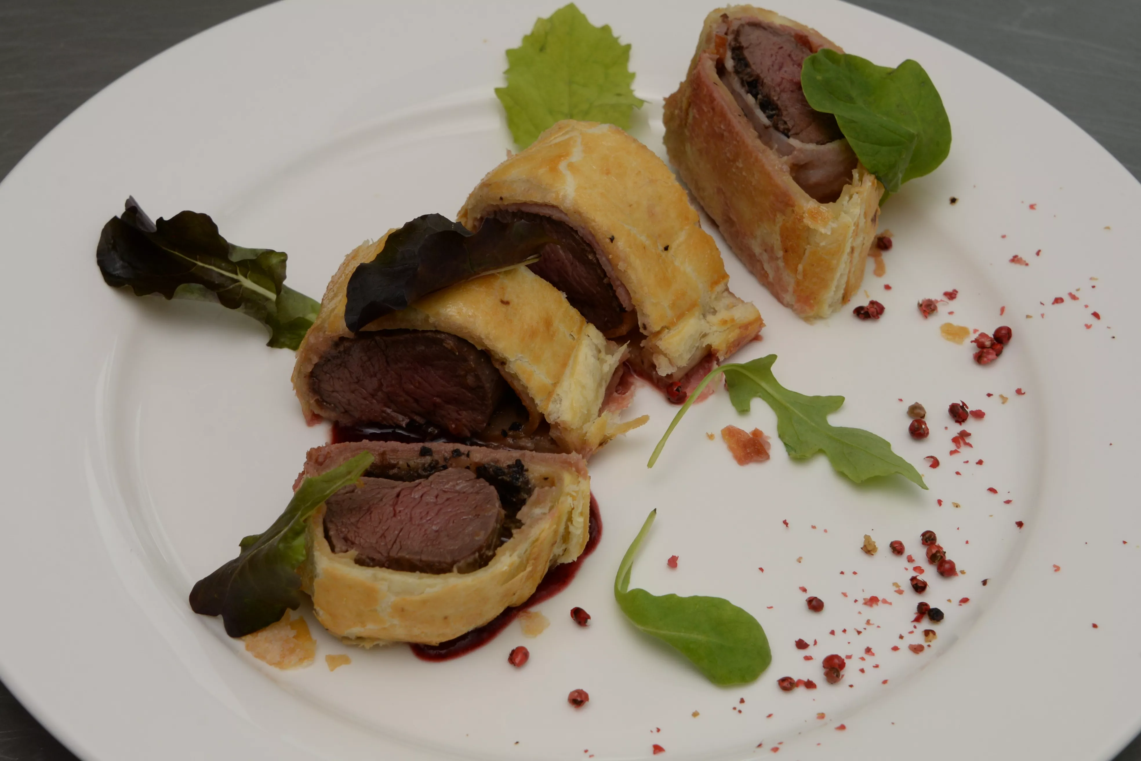 Для приготовления одной порции нам потребуются следующие ингредиенты: филе говядины – 150 г, 40 г бекона, 30 г грибной икры из шампиньонов, 15 г горчицы, слоёное тесто, одно яйцо куриное и немного розмарина. Зелень для пикантности.