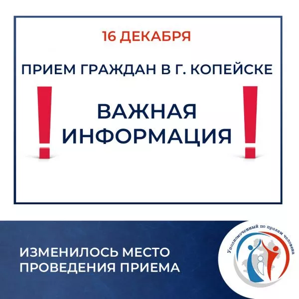 В связи с большим количеством желающих место проведения личного приема уполномоченного по правам человека Юлии Сударенко изменилось. Завтра, 16 декабря прием пройдет по адресу: г. Копейск, ул. Ленина, 40 (Копейский политехнический колледж)