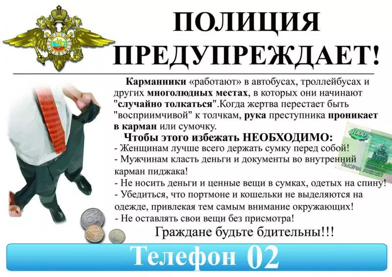 Самый верный способ не стать жертвой карманника – это не демонстрировать без необходимости дорогой мобильный телефон, не показывать окружающим крупную сумму денег в кошельке, не держать ценности в легкодоступном месте и вообще следить за тем, что происходит вокруг. Главный союзник карманного вора – это невнимательность граждан. Постарайтесь во время покупок не выпускать из поля зрения свои вещи.
