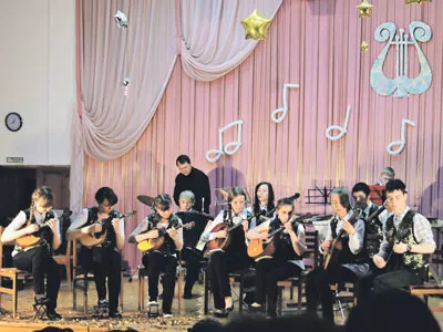 Илья: - Начнем с того, что в нашей школе есть оркестр и ансамбль с названием «Гармония». Те ребята, что играют в ансамбле, играют и в оркестре, это, так сказать, малый состав оркестра. Что касается инструментов, то основа коллектива - это балалайки (прима, секунда, контрабас) и домры (прима, альт, бас). Также используем баяны и различные ударные и шумовые инструменты, с помощью которых мы богато оформляем нашу игру. В этом году в одной из пьес использовали рояль. «Изюминкой» нашего коллектива можно считать гусли.