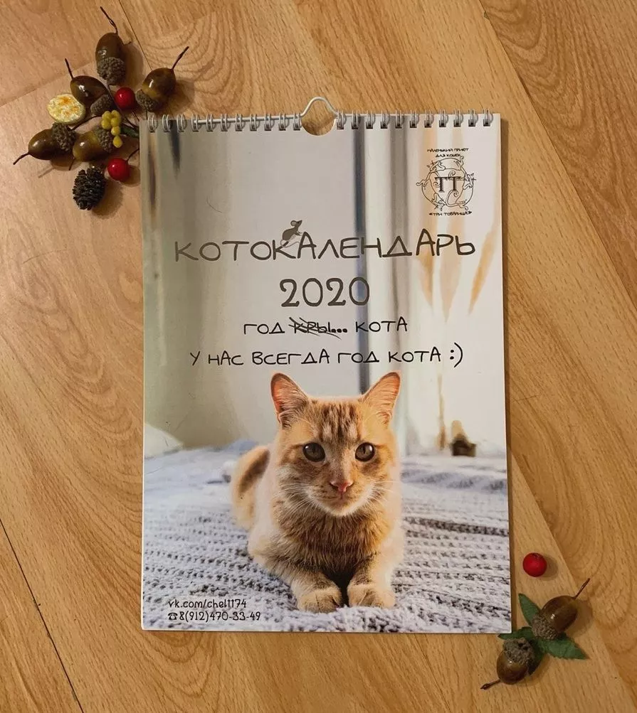 Владельцы приюта для кошек «Три товарища» к Новому году сделали перекидной настенный календарь, где каждый месяц на тебя смотрят пронзительные кошачьи глазки. Кроме того, в календаре есть особые даты, которые связаны с кошками и защитой животных. Есть и календарики на ту же тематику.