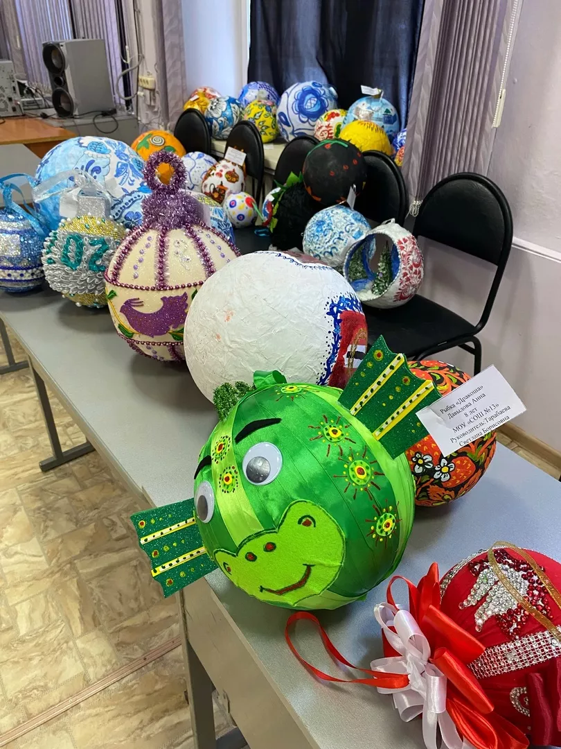 Дети создали прекрасные игрушки для украшения елок в поселках города. Тема конкурса была посвящена красоте орнаментов России. Были использованы различные техники исполнения, включая папье-маше, текстиль, вязание и конструирование из различных материалов.