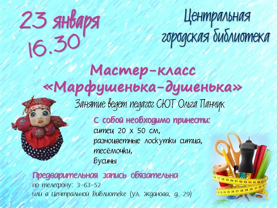 На мастер-класс нужно взять отрез ткани (ситец) размером 20 на 50 сантиметров, а также лоскутки разного цвета, тесемки и бусины. На мероприятие стоит записаться заранее по телефону: 3-63-52.