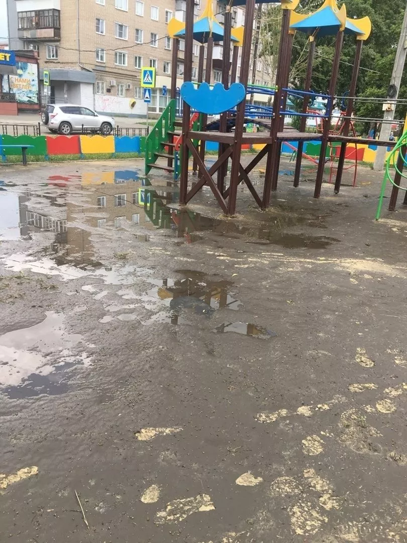 Напомним, что накануне на детской площадке было заменено старое резиновое покрытие на песочек. Ливень привел к загрязнению песка. По данным управления благоустройства КГО, песок с площадки не смыт, его нет на прилегающей территории.