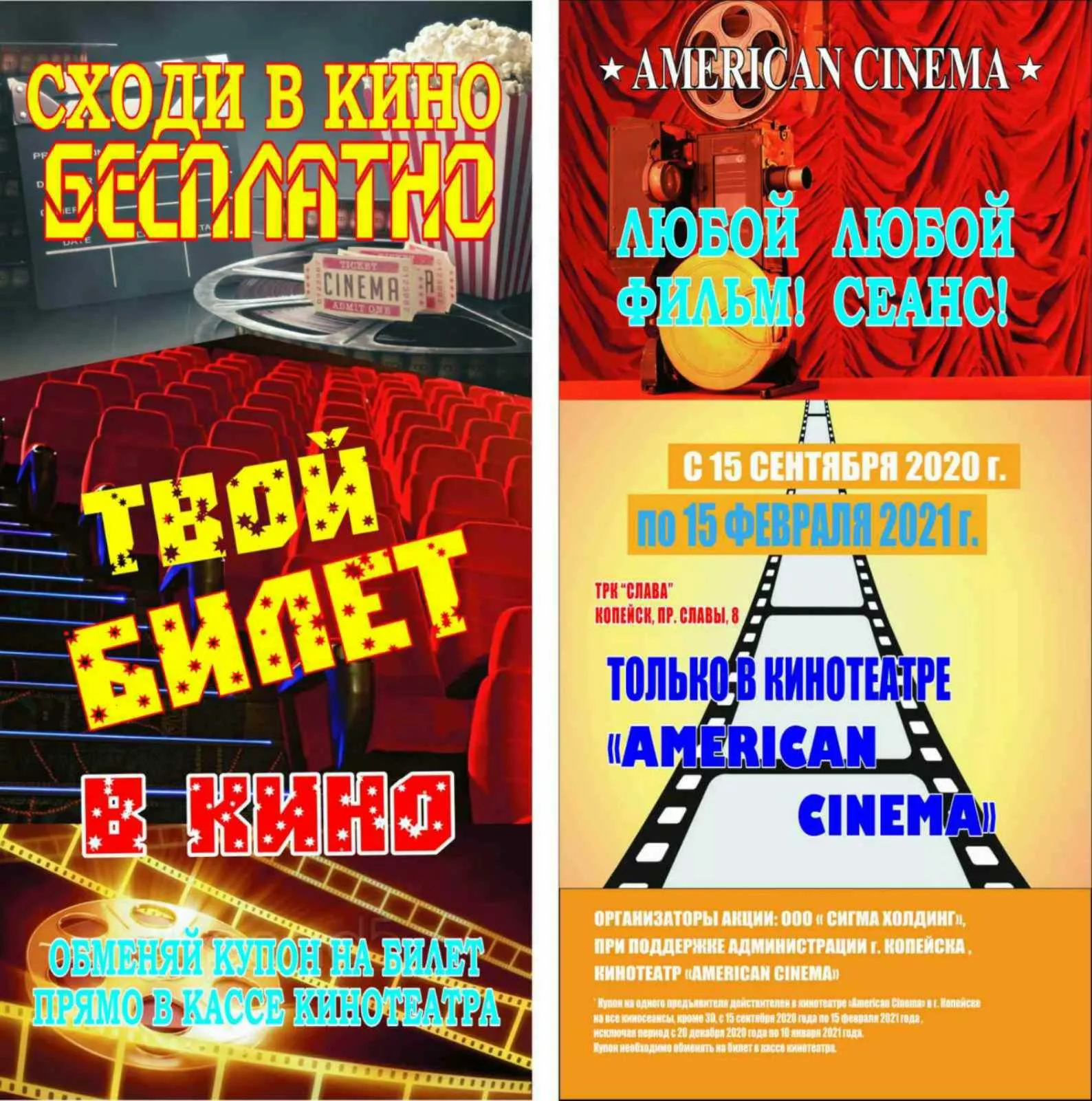 Проект «Проголосовал – сходи в кино» реализуется при поддержке администрации Копейска, спонсорами акции стали компания «Сигма холдинг» и кинотеатр «American Cinema».