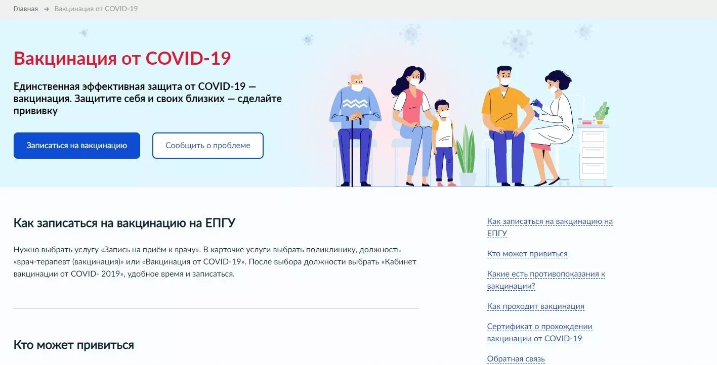 Откроется страница, вверху которой надпись красными буквами: «Вакцинация от COVID-19». Чуть ниже – синий прямоугольник «Записаться на вакцинацию». Но не спешите на него нажимать – сначала пролистайте страницу вниз и прочтите информацию, которую необходимо знать, прежде чем записываться на вакцинацию: о том, кто может привиться, какие существуют противопоказания, кого вакцинируют в первую очередь, а также об этапах вакцинации. Ознакомившись с этой информацией, можно переходить к записи: нажмите на тот самый синий прямоугольник со словами «Записаться на вакцинацию». Выберите свой регион и человека, которому необходимо привиться. Далее действуйте по аналогии.