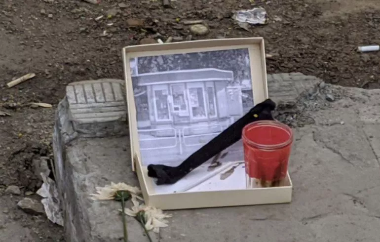 В минувшие выходные на популярном развлекательном портале Pikabu.ru появилась фотография места на пешеходной улице Челябинска, где раньше находился киоск. Здесь в рамке с траурной лентой кто-то поставил фотографию ларька, а также поместил цветы и стакан с напитком.