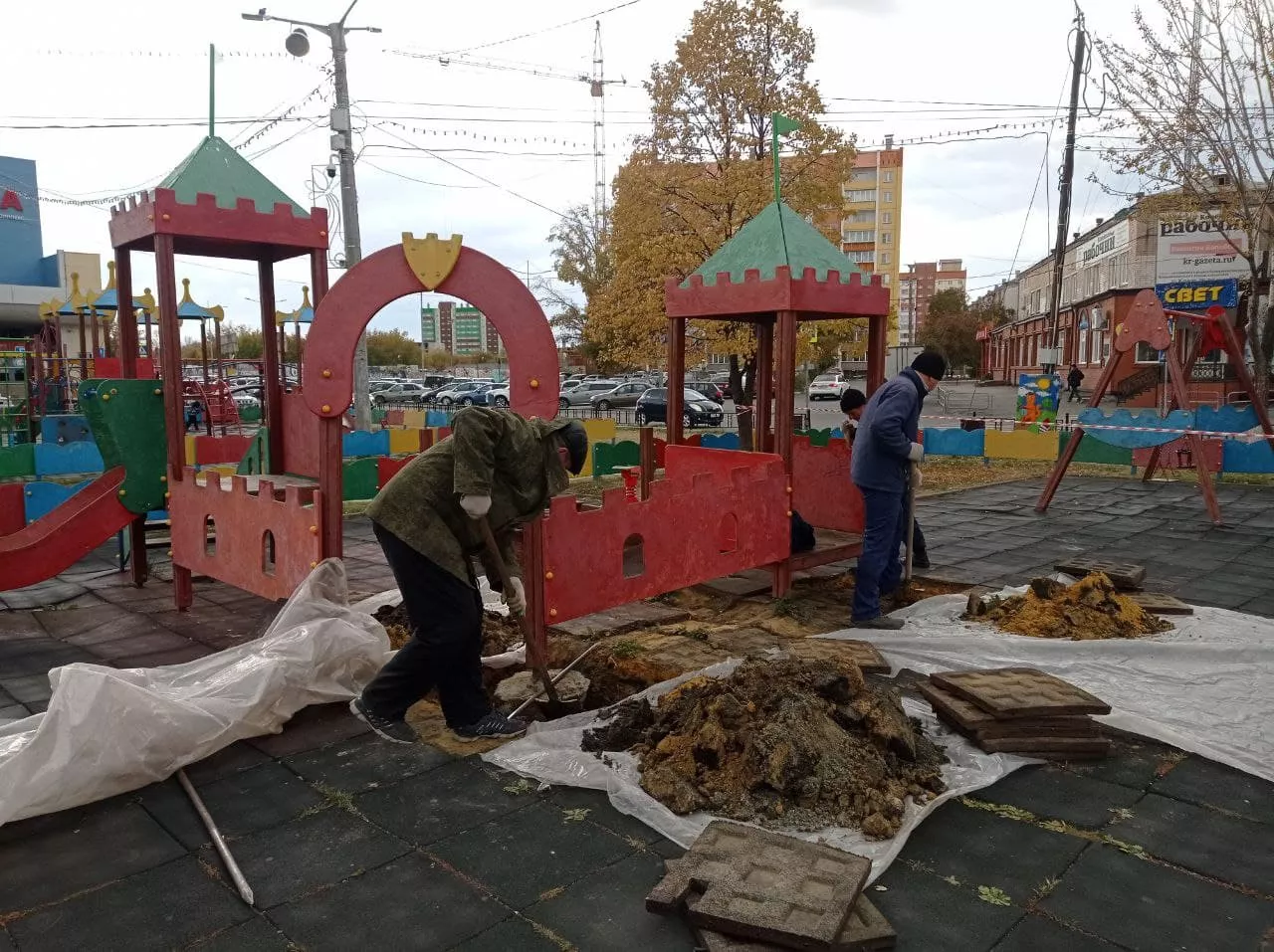 Детские площадки на главной площади города временно закрыты для посещения. Здесь ведут ремонтные работы.
