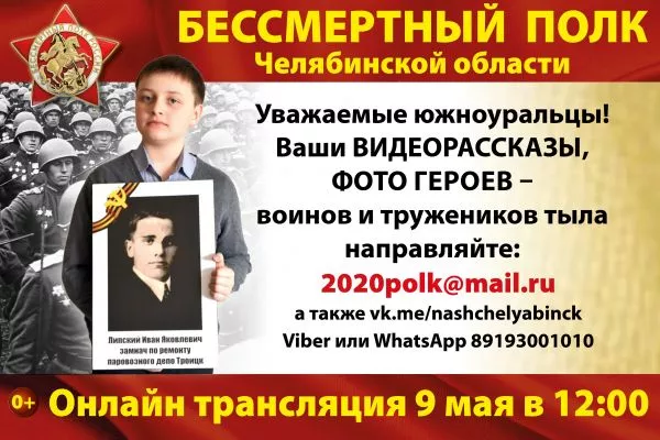 Трансляция пройдет в День Победы с 12:00 часов одновременно в Инстаграм, «ВКонтакте» и Facebook, на ресурсе «Одноклассники», а также в городских сообществах «Наш Челябинск», «Регион 74» и «Челябинск-online». Мероприятие также будет транслироваться в сообществе Народного фронта в Челябинской области. Вступить в группу можно по ссылке.